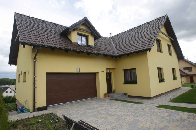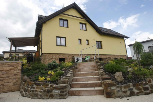 Velkorysá dřevostavba pro čtyřčlennou rodinu má sklep s úložnými prostory zapuštěný ve svahu. V přízemí je garáž a obytné místnosti, v prvním patře ložnice a vstup na půdu, v níž by teoreticky v budoucnu mohly být také obytné pokoje. Montovaná stavba, jejíž konstrukci tvoří panelový systém, byla hotová na klíč během šesti měsíců. Ze stavebních materiálů dům tvoří zejména dřevěný rám z KVH profilů, 30 cm tepelně zvuková izolace a plošné materiály na bázi dřeva: OSB deska, která slouží jako parobrzda, a Rigidur. Stavba má tzv. difuzně otevřenou konstrukci, zvnějšku je opatřena provětrávanou fasádou. Mezi fasádou a izolací je vzduchová mezera, která umožňuje směrem ze spodní části vzhůru odvětrávání vlhkosti vzniklé v domě prošlé stěnou. Při oslunění pak odvětrává teplý vzduch z povrchu. V zimních měsících obyvatelé domu využívají rekuperaci, která zajistí čerstvý vzduch bez otevírání oken, ale na léto ji vypínají, otevírají okna nebo při velkých vedrech využívají klimatizační jednotku. Rodinný dům má i difúzně otevřenou střechu. Majitel domu si vyprojektoval nadkrokevní tepelnou izolaci z dřevovláknité desky Inthermo. Ze spodní strany jsou krokve pobity OSB deskami, které tvoří parobrzdu. Kvůli odhlučnění přízemí a prvního patra je mezi patry betonový strop. Energetickou úspornost velkého domu podporuje nejen použitý materiál, ale také kvalitní izolace (včetně na míru zhotovených dřevěných oken s dvojskly a dveří) a orientace obytných místností na jih. Zatímco v tomto směru najdeme ve zdech okna velká, na severní straně domu, kde jsou v přízemí garáž a nad ní šatna jako součást ložnice, okna chybějí. Majitel domu volil místo střešních oken vikýře, aby se vrchní patro nepřehřívalo. Sluneční svit je tak pro tepelnou pohodu v interiéru využit optimálně. Pod vrchní střešní krytinou stavby na krovech se nachází dřevovláknitá deska, která se za slunečního svitu prohřívá zhruba sedm hodin. Vzduch v podkroví a v prvním patře se díky ní v čase nejintenzivnějšího svitu nepřehřívá a následně postupně uvolňuje ve večerních chladnějších hodinách získané teplo.