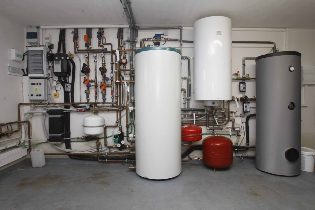 V centru celé sestavy se nachází akumulační nádrž o objemu 500 litrů s výměníkem na ohřev teplé užitkové vody, která slouží k akumulaci tepla na vytápění. Nádrž je natápěna tepelným čerpadlem (voda – vzuch) nebo teplovodním výměníkem od krbu. Z akumulační nádrže proudí topná voda to systému (do podlahového topení a radiátorů) a slouží prostřednictvím výměníku k ohřevu teplé užitkové vody. Na pravé straně je zavěšen elektrický bojler o objemu 200 litrů, který slouží v zimních měsících k dohřevu TUV na požadovanou teplotu. Na konci sestavy je vpravo solární zásobník teplé vody o objemu 300 litrů, kde je ukládána teplá voda ze slunečních termických kolektorů. Od jara do podzimu se o teplou užitkovou vodu stará sluníčko, pouze v přechodných měsících nebo při zatažených dnech dohřívá vodu ze solárního systému elektrický bojler. V letních měsících dosahuje teplota ohřáté vody v solárním zásobníku 90°C a je možno tuto vodu ze solárního zásobníku přepouštět do bazénu. V levé části fotografie je vidět výměník tepla od tepelného čerpadla, čerpadlová skupina do systému, expanzní nádoby, řídící jednotka tepelného čerpadla a solárního sytému. Celý systém je zregulovaný a pro vytápění je využívána ekvitermní regulace s čidlem na severní fasádě. Tzn. že teplota topné vody je závislá na venkovní teplotě. Konečnou teplotu v rodinném domě lze regulovat termostaty umístěnými v každé místnosti.